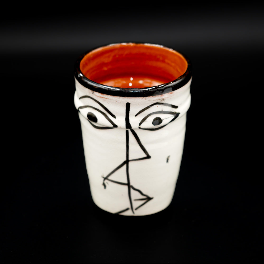 Chaque gobelet est une pièce unique, à l’image du visage qui l’habite : légèrement différent à chaque création, comme un reflet de notre diversité. La terre cuite, chaleureuse et vivante, dialogue ici avec l’émail blanc pour créer un objet contrasté, brut et raffiné à la fois.
